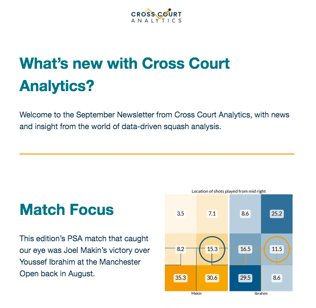 Our Blog Cross Court Analytics 02/07/2022 Cross Court Analytics 02/07/2022 Who are we and how can we help you Read More Cross Court Analytics 26/06/2022 Cross Court Analytics 26/06/2022 Asal walks it Read More Cross Court Analytics 15/06/2022 Cross Court Analytics 15/06/2022 Data for SquashTV in World Championship Finals Read More Cross Court Analytics 25/05/2022 Cross Court Analytics 25/05/2022 Six and counting Read More Cross Court Analytics 30/04/2022 Cross Court Analytics 30/04/2022 Working with England Squash Read More Cross Court Analytics 07/04/2022 Cross Court Analytics 07/04/2022 A new tactic from Coll? Read More Cross Court Analytics 22/03/2022 Cross Court Analytics 22/03/2022 How long is a typical squash rally? Read More Cross Court Analytics 30/12/2021 Cross Court Analytics 30/12/2021 Risk Reward Squash Read More Cross Court Analytics 22/12/2021 Cross Court Analytics 22/12/2021 What is Coll doing differently? Read More Cross Court Analytics 18/12/2021 Cross Court Analytics 18/12/2021 Tactical Breakdown with Ahad Raza Read More Cross Court Analytics 21/11/2021 Cross Court Analytics 21/11/2021 Spot the difference Read More Cross Court Analytics 15/10/2021 Cross Court Analytics 15/10/2021 Monthly Newsletter Read More Newer Posts Older Posts